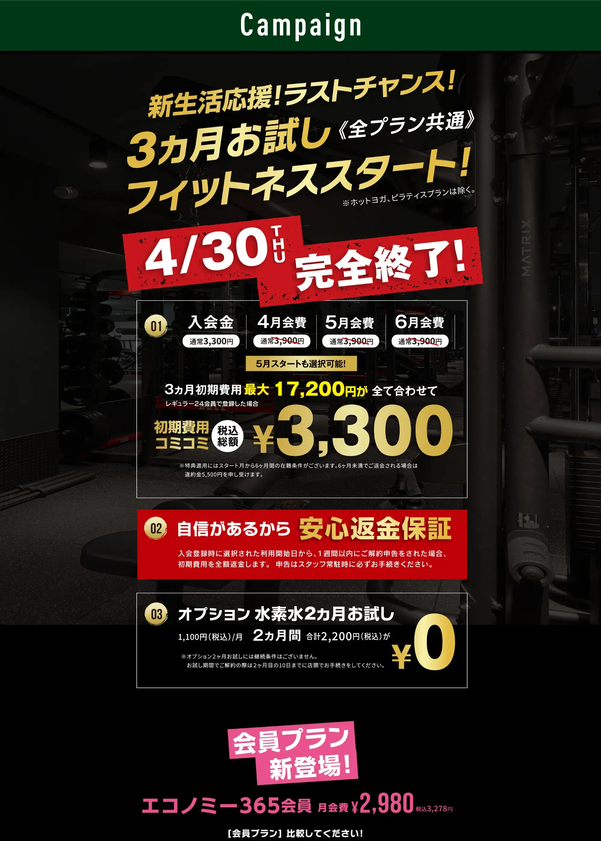 キャンペーンでご入会いただいた場合、在籍条件がございます。在籍条件に満たない解約は、違約金5,500円(税込)を申し受けます。